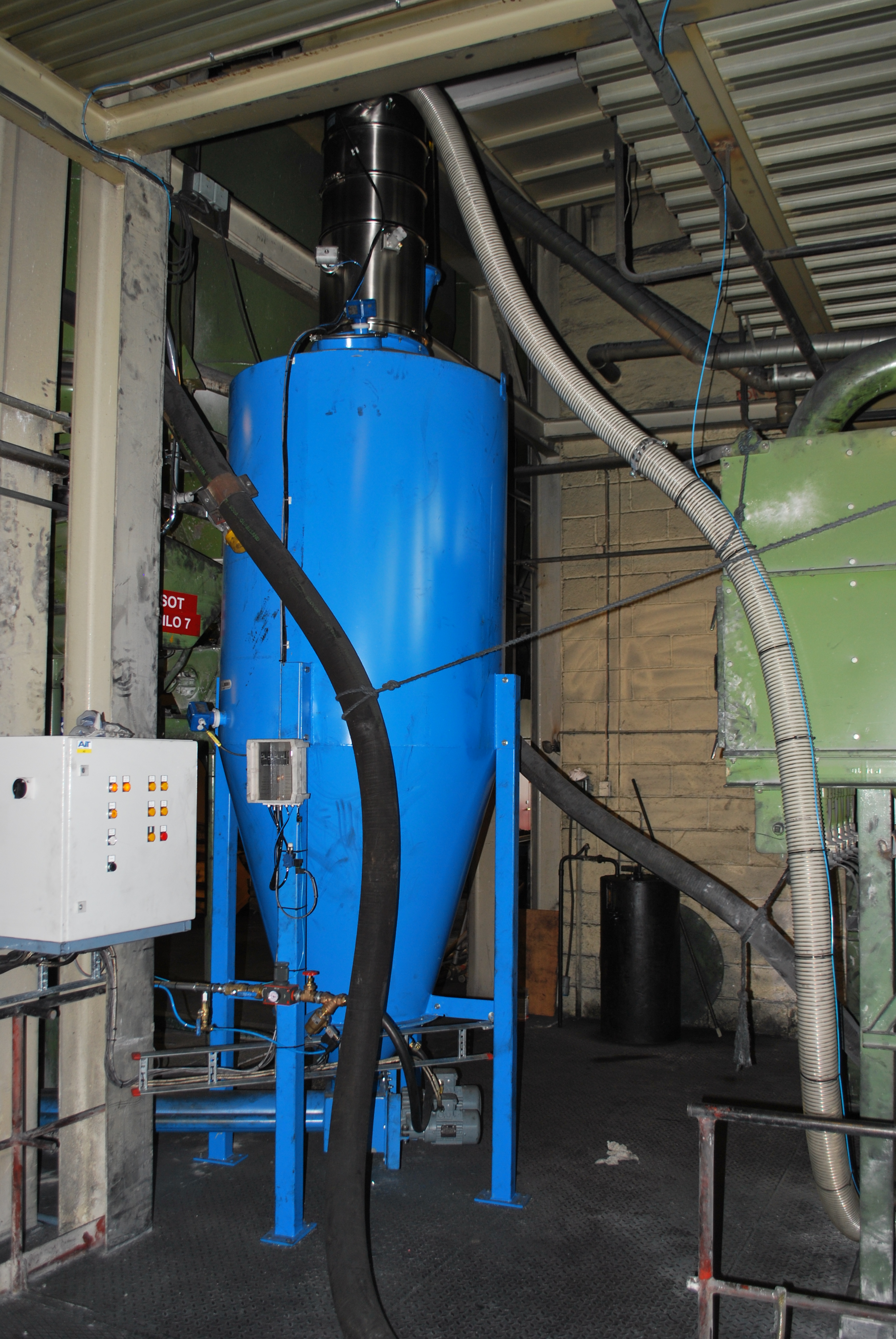 Trykket til delta er p -0,5 bar for kapasiteter opp til 10 m3/t. Bildet viser en Bruvik mottakssilo med vakuumtransportør og dobbel doserskrue på utløpet av siloen.