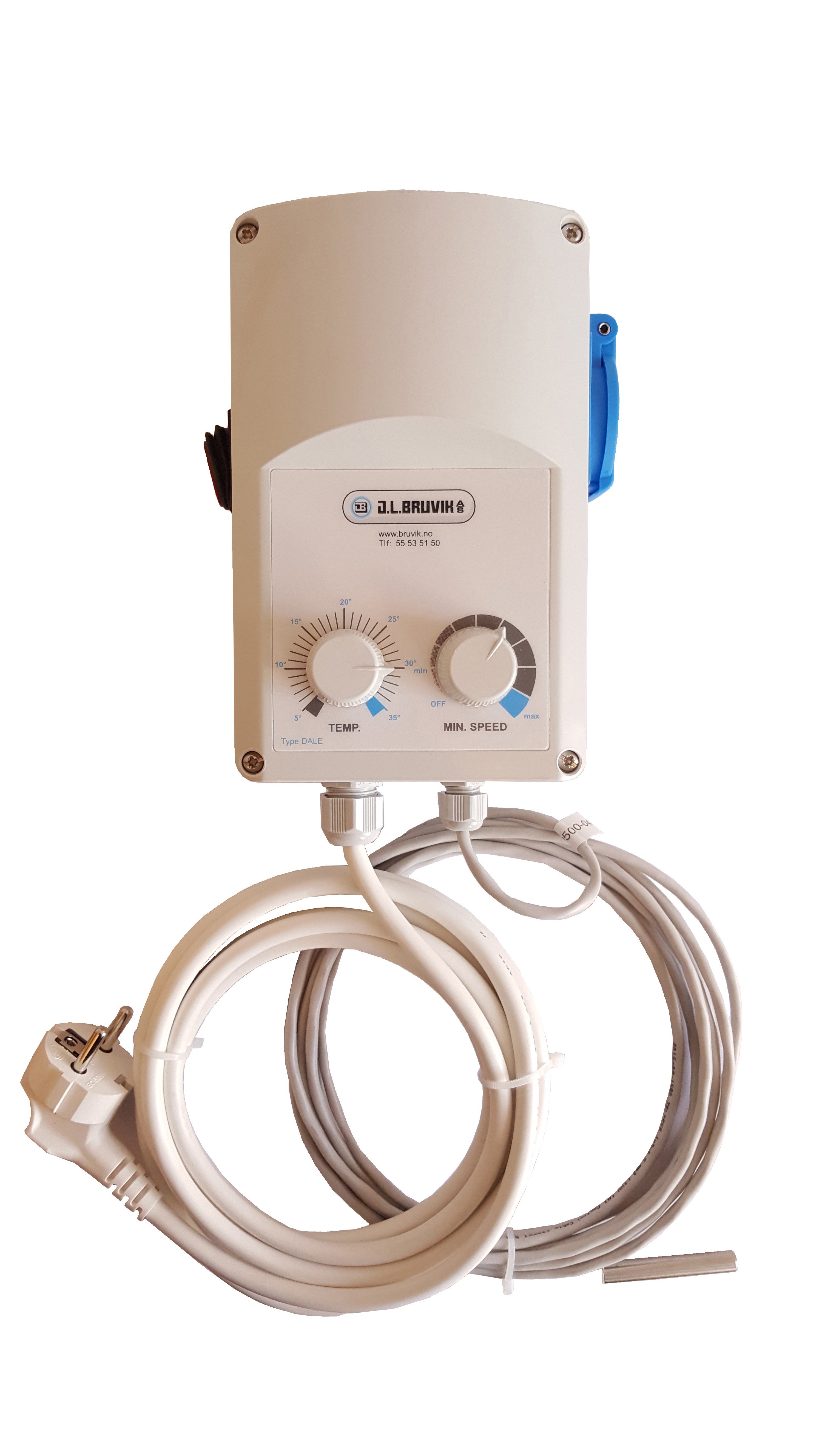 Dale er en enkel og anvendelig regulator for både landbruk og industri, som automatisk regulerer hastigheten på 1-fase hastighetsregulerbare motorer/vifter (opptil 6A) etter temperatur. Makshastighet kan justeres med et internt potmeter. Minimumhastighet og temperatur justeres i front på regulatoren. Kan valgfritt gå ned til minimumhastighet, eller slå viften helt av ved en temperatur lavere enn innstilt romtemperatur. Den har også et justerbart proporsjonalområde (P-bånd) for viftehastighet. Utstyrt med modbus RTU-kommunikasjon slik at den om ønskelig kan tilkobles og overvåkes eller styres fra PC. Romtemperatursensor medfølger!